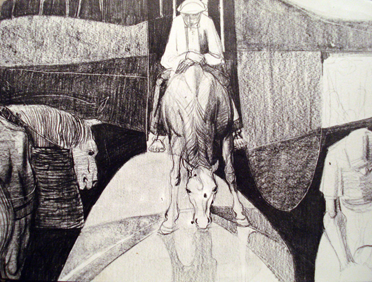 Valmeri (mulher do artista) observando Bandeira de Mello esboçando a carvão o Painel da CAIXA, 1972