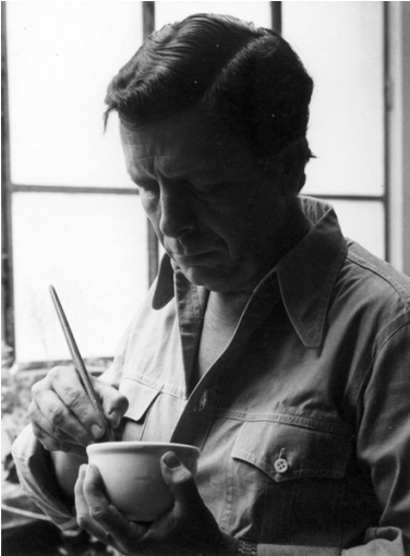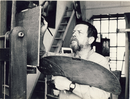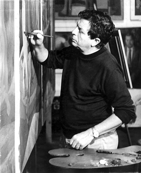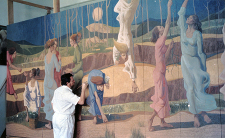 Bandeira de Mello pintando um painel realizado para uma construtora de BH, 1982